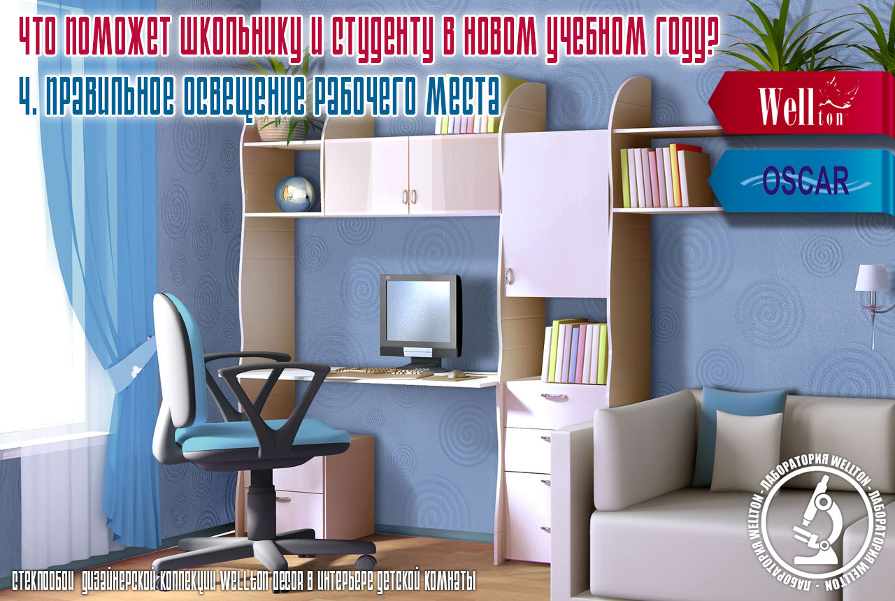 От того, насколько качественно и правильно освещено рабочее место школьника зависит многое. Неправильное (как слишком тусклое, так и слишком яркое) освещение может даже спровоцировать сильные головные боли. Поскольку свет имеет свойство отражаться и рассеиваться, гладкие виниловые или бумажные обои могут создавать неправильное отражение, особенно если виниловые обои дополнены какими-то блестящими элементами орнамента. И только высокорельефные фактуры стеклообоев Wellton и Oscar могут исправить ситуацию. Полотна стеклообоев Wellton и Oscar создают идеальную отражающую поверхность, благодаря которой свет равномерно рассеивается, без формирования ярких узконаправленных лучей и бликов.