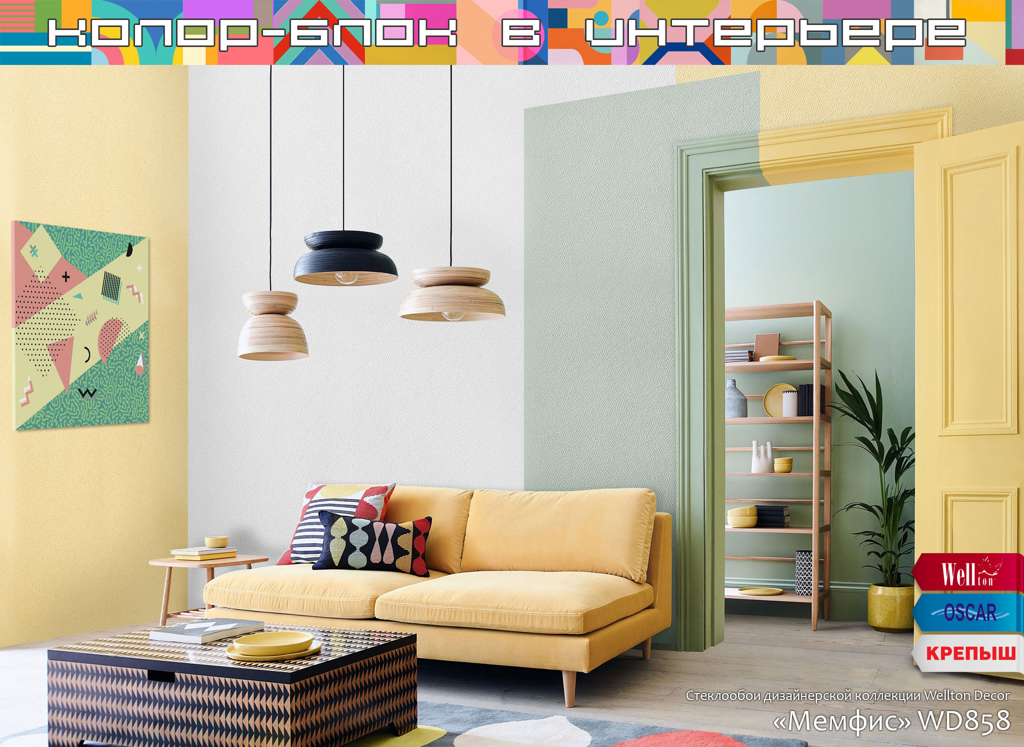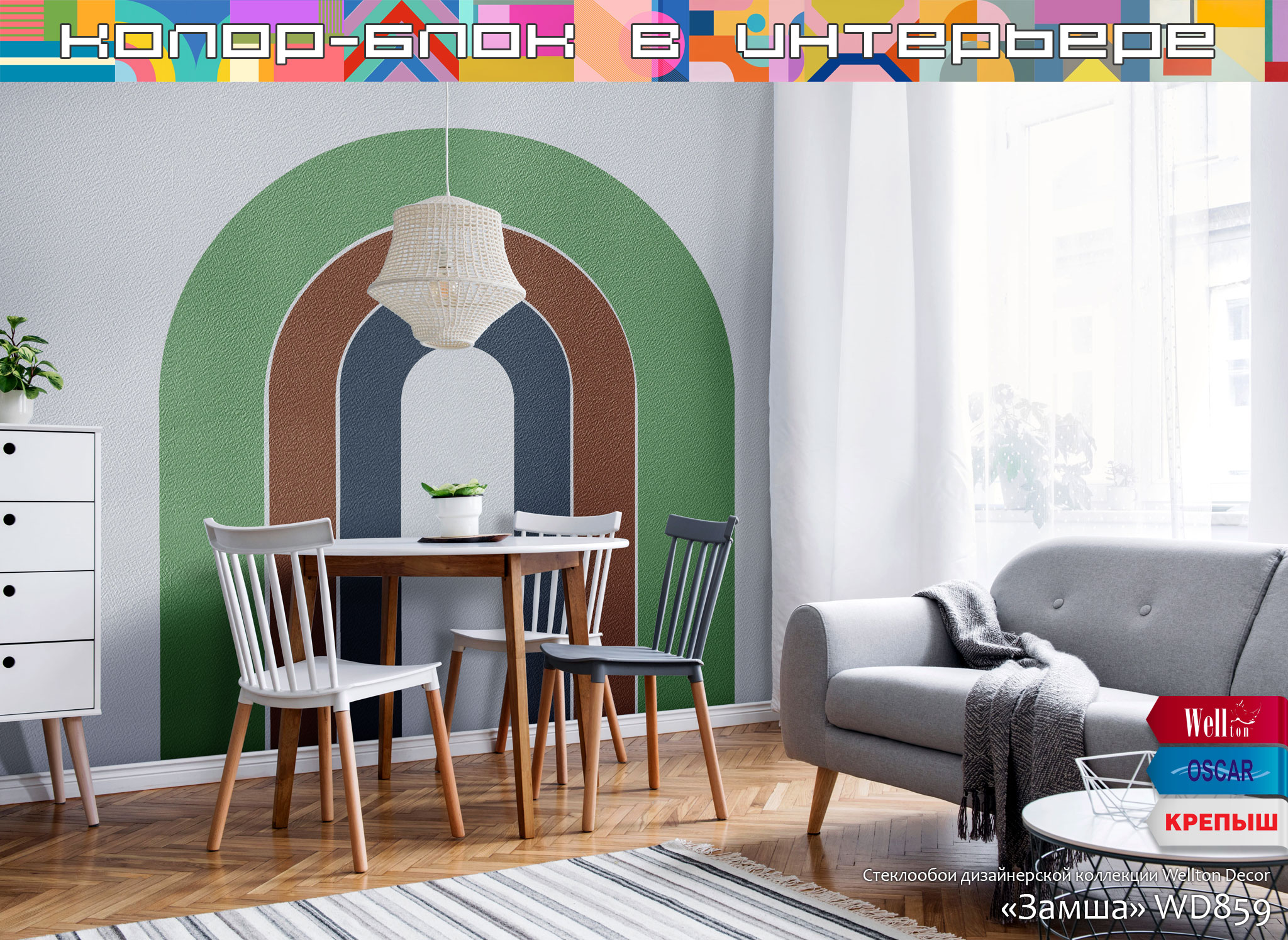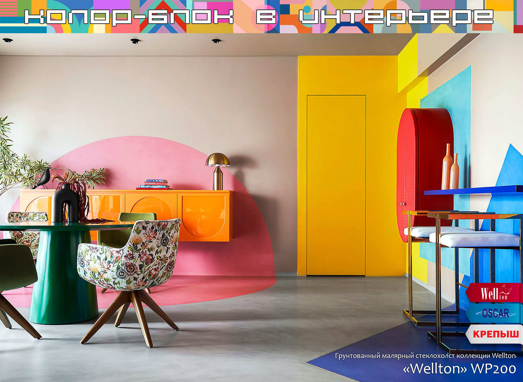 Главным и очевидным правилом, которое важно соблюсти при планировании интерьера в стиле колор-блок – это использование в интерьере поверхностей под окраску. Понятно, что ни о каком стиле и красоте с архаичными обоями «в цветочек» или «с вензельками» речи быть не может. Именно гладкие стены или использование обоев под покраску дают невероятные возможности в оформлении пространств, в том числе и с помощью техники колор-блок. Как показывает наш опыт более чем в четверть века, техника окрашивания колор-блок одинаково потрясающе смотрится на гладких поверхностях, оформленных с помощью малярных стеклохолстов или флизелиновых холстов Wellton, Oscar и КРЕПЫШ, и на рельефных полотнах стеклообоев профессиональной серии Oscar, на классических фактурах стеклообоев Wellton Optima и, конечно же, на жаккардовых стеклообоях нашей дизайнерской коллекции Wellton Decor.