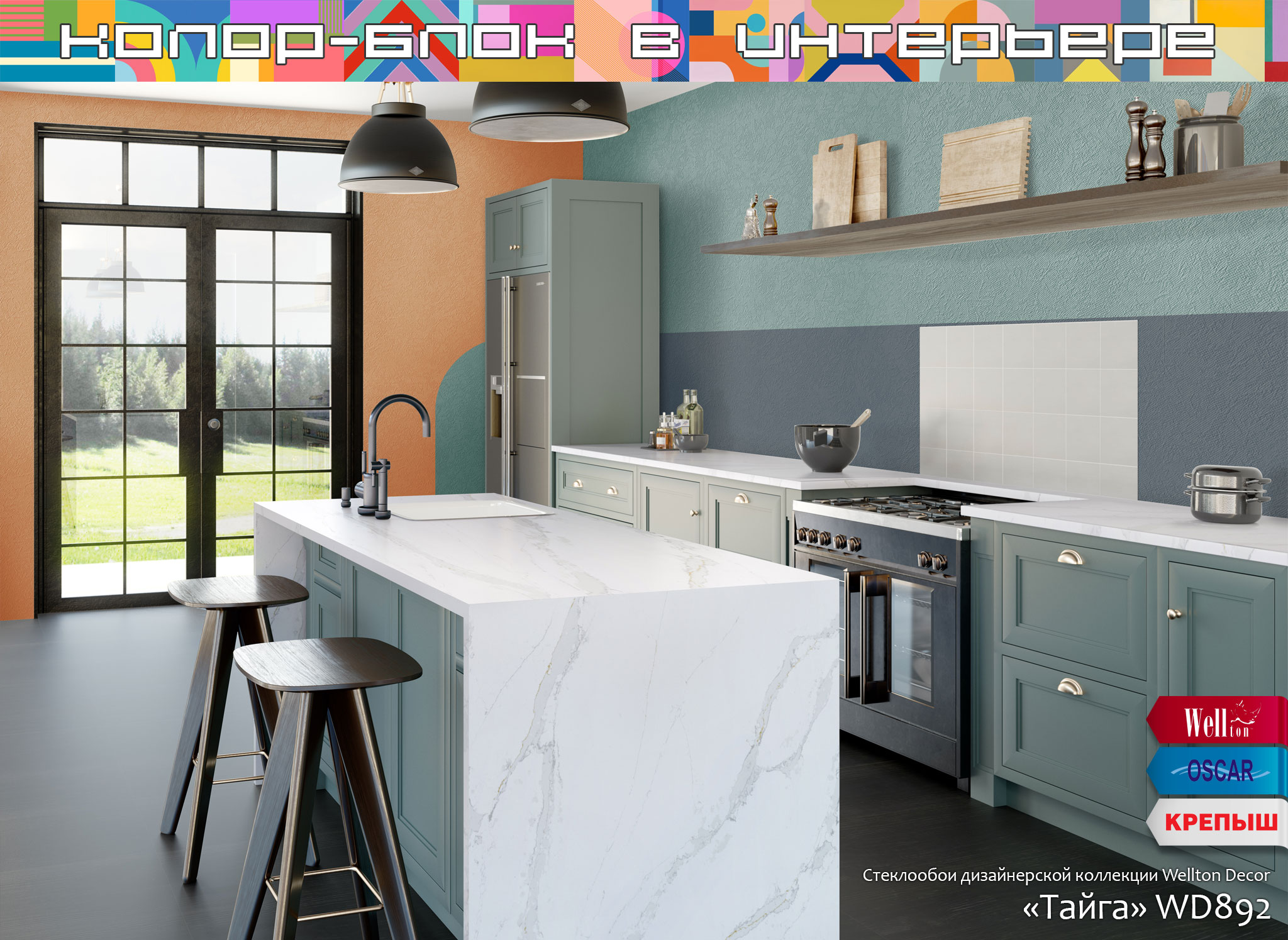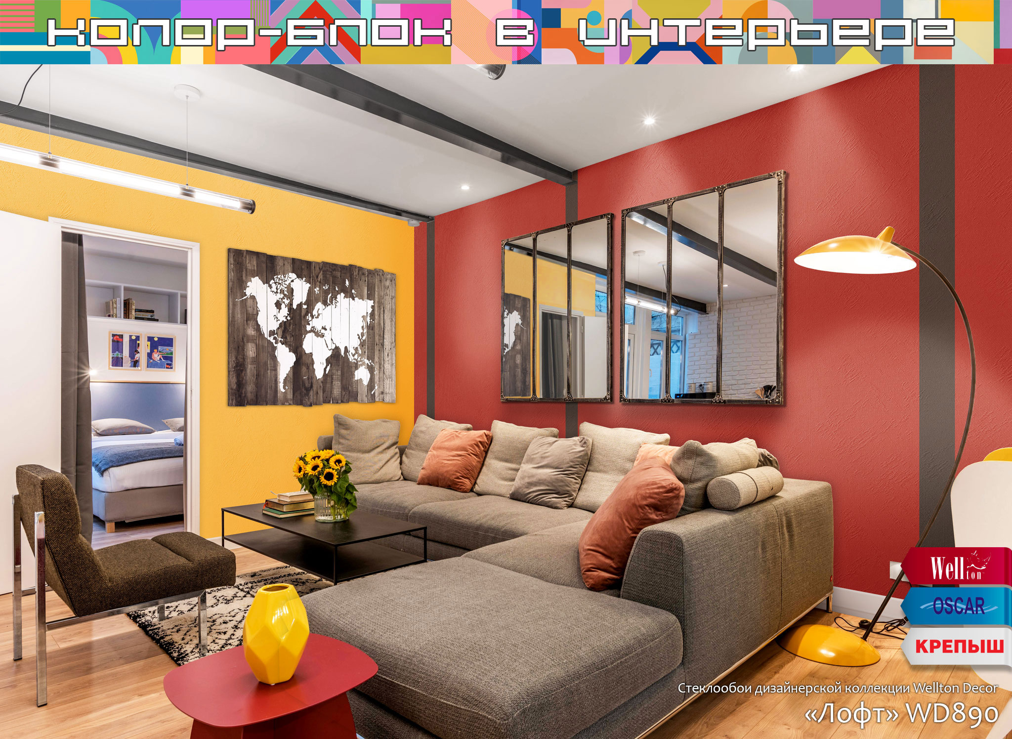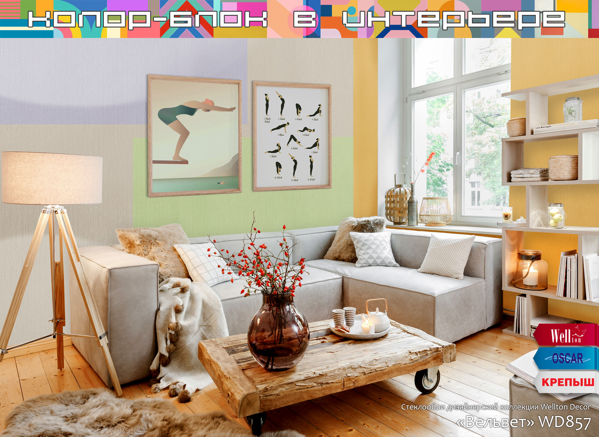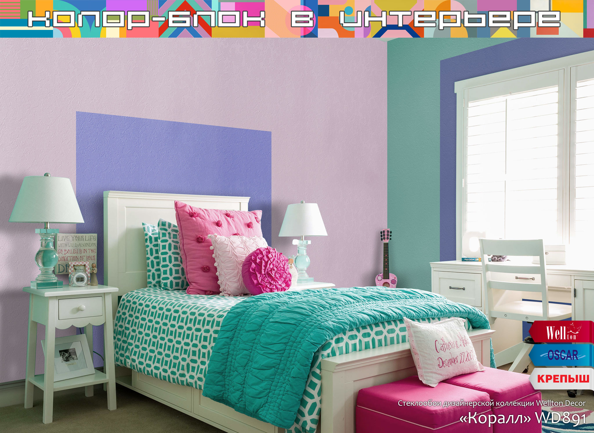 Главным и очевидным правилом, которое важно соблюсти при планировании интерьера в стиле колор-блок – это использование в интерьере поверхностей под окраску. Понятно, что ни о каком стиле и красоте с архаичными обоями «в цветочек» или «с вензельками» речи быть не может. Именно гладкие стены или использование обоев под покраску дают невероятные возможности в оформлении пространств, в том числе и с помощью техники колор-блок. Как показывает наш опыт более чем в четверть века, техника окрашивания колор-блок одинаково потрясающе смотрится на гладких поверхностях, оформленных с помощью малярных стеклохолстов или флизелиновых холстов Wellton, Oscar и КРЕПЫШ, и на рельефных полотнах стеклообоев профессиональной серии Oscar, на классических фактурах стеклообоев Wellton Optima и, конечно же, на жаккардовых стеклообоях нашей дизайнерской коллекции Wellton Decor.