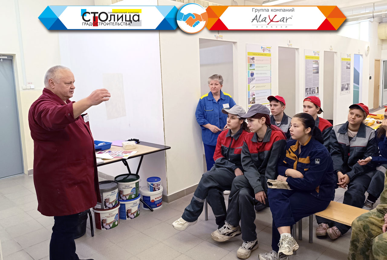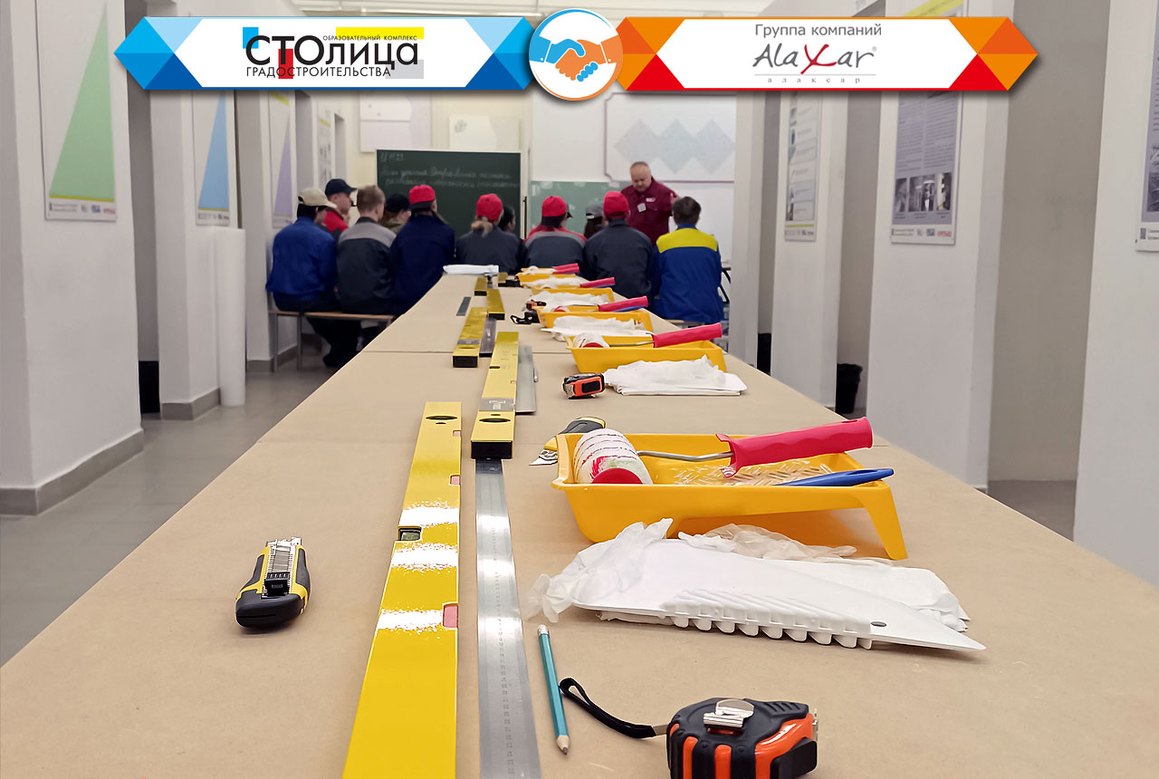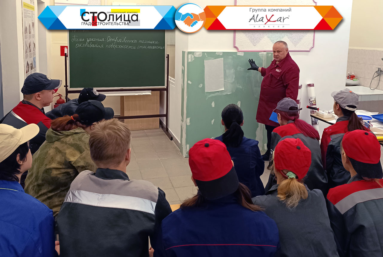 Темой этого расширенного занятия стало ознакомление с современными отделочными материалами высокой степени готовности и технологий работы с ними. Как того требует учебный процесс, занятие было разделено на теоретическую и практическую часть, позволяющую закрепить полученные в теории знания на практике. Благо достойное техническое оснащение ГБПОУ ОКГ «Столица» позволяет выполнить на любые виды отделочных работ, в том числе и с использованием наших инновационных материалов. Это занятие не является единичным обособленным мероприятием, поскольку оно включено в единую учебную программу, разработанную КГ «Алаксар» совместно с ГБПОУ ОКГ «Столица» в прошлом году.