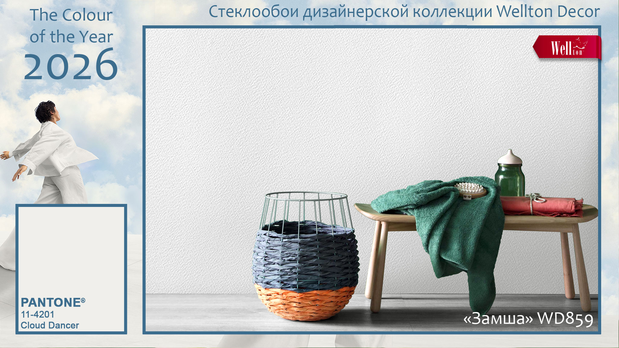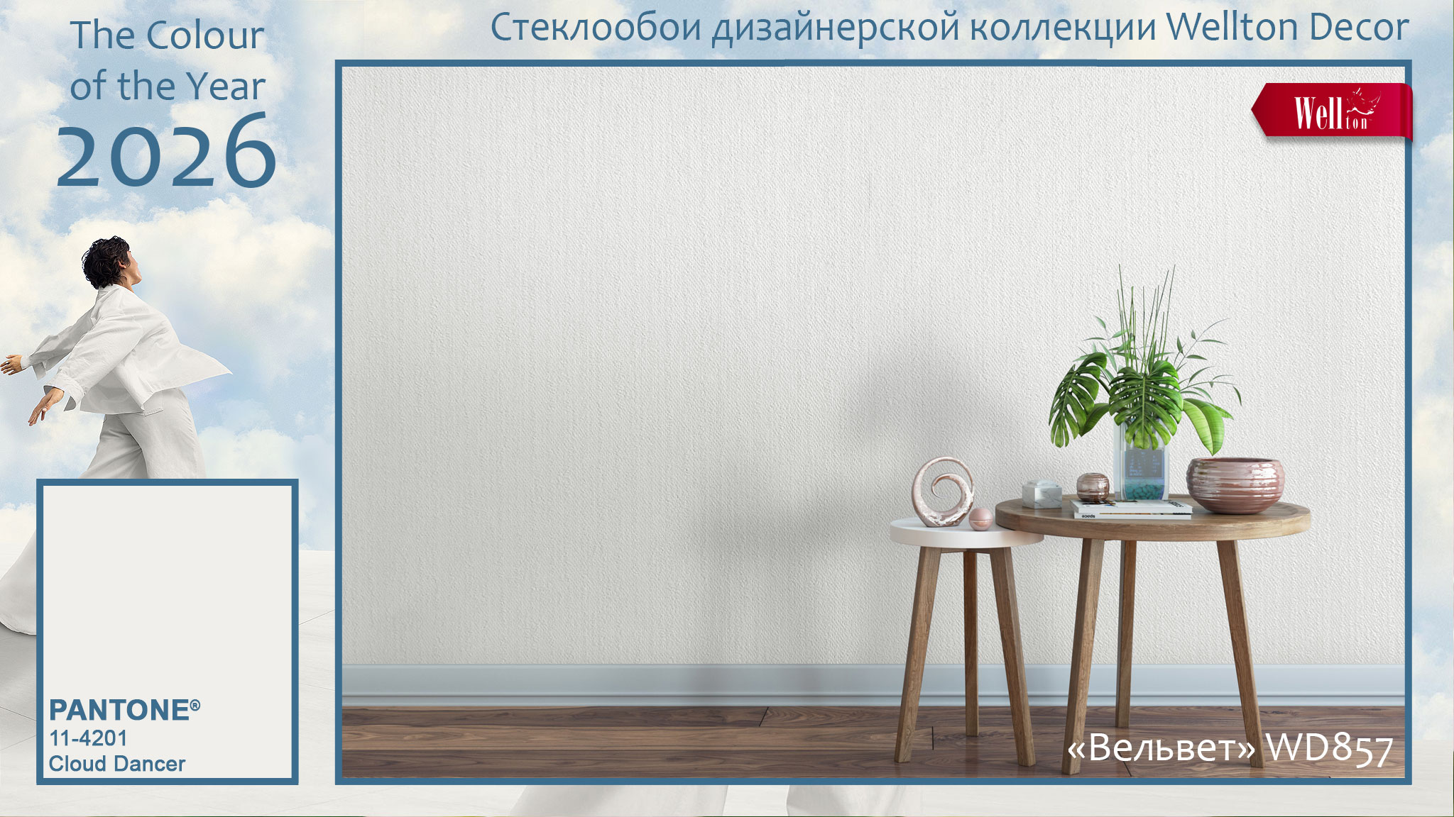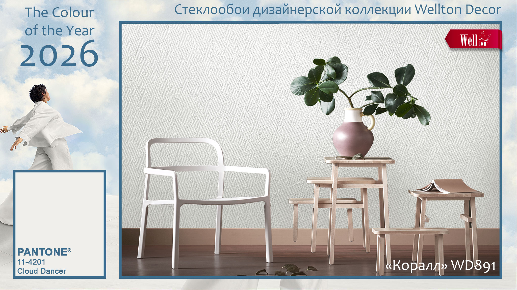 Цвет 2026 года «Cloud Dancer» может быть многоликим, если использовать его на высокорельефных фактурах стеклообоев Wellton и Oscar. Благодаря тканому плетению полотен дизайнерских и классических стеклообоев, белый цвет на них может варьировать не только свою яркость за счёт светотени, но и даже впитывать в себя другие оттенки, отражая цветовую гамму интерьера. А на гладких фактурах малярных стеклохолстов и флизелина Wellton, Oscar и КРЕПЫШ белый характер «Cloud Dancer» проявляет себя с неожиданной стороны, позволяя создавать идеальные фоновые решения для стильных интерьеров. Ведь белый цвет и его многочисленные оттенки в интерьере – это вечная классика, которая вряд ли в ближайшие годы бесследно исчезнет из модных трендов.