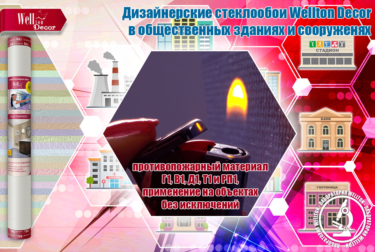 Говоря о том, почему всё больше общественных зданий и сооружений отделываются дизайнерскими стеклообоями Wellton Decor, нельзя не вспомнить и про потрясающие противопожарные свойства наших стеклообоев, подтверждённые сертификатом соответствия, гарантирующим сдачу объекта без проблем и последующую безопасную эксплуатацию объекта. Ведь именно наши стеклообои Wellton Decor являются слабогорючими, трудоновоспламеняемыми, обладают малой дымообразующей способностью и практически не имеют опасности по токсичности продуктов горения. А ещё они не распространяют пламя по поверхности, показав при тестированиях отличный результат РП1.