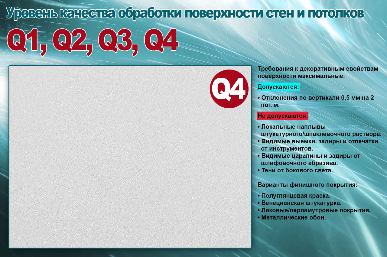 Последним уровнем качества в системе является Q4, который предъявляет повышенные требования к поверхностям. На них буквально не должно быть никаких дефектов и изъянов, а вертикальные отклонения практически не допускаются. Это достигается финишными и суперфинишными шпатлёвками за счёт тонкослойного шпатлевания и тщательным ошкуриванием всей поверхности. Такой уровень обработки поверхности применяется довольно редко, поскольку предназначен под совершенно глянцевые финишные покрытия, не часто используемые в жилых интерьерах. Раньше такой уровень покрытия делали под венецианскую штукатурку, но сейчас этот материал также почти не используется в современных интерьерах. И, поскольку уровень Q4 встречается крайне редко, мастера штукатуры, при повышенных запросах заказчиков, говорят об уровне Q3+, который немного повышает стандарт третьего уровня, не дотягивая до строгостей четвёртого.